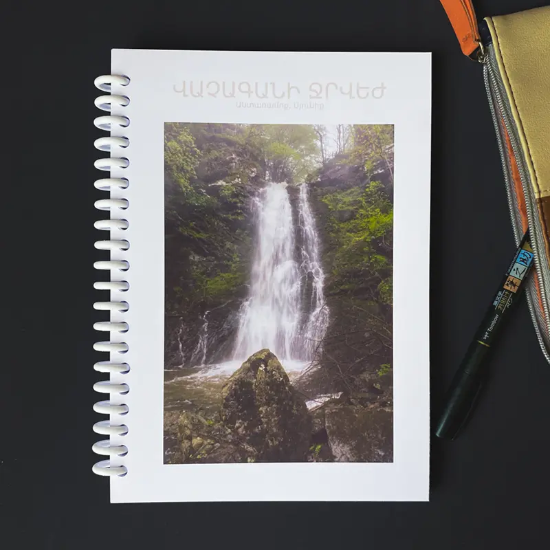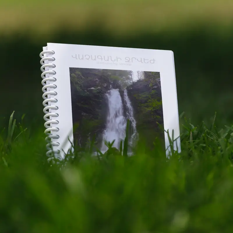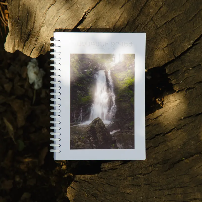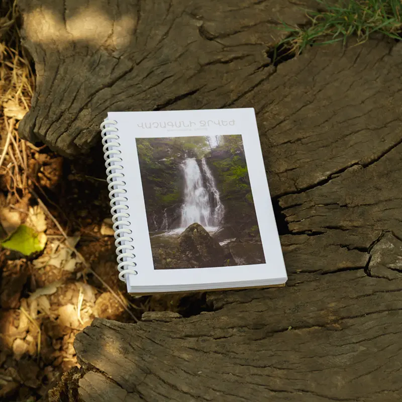 Notepad “Vachagan Waterfall” features a misty waterfall in a lush spring forest, framed by rocky cliffs. A moody glimpse of the jewel of Antaramoq Gorge.